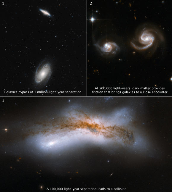 These visual representations delineate three potential interaction scenarios involving our Milky Way Galaxy and the proximate Andromeda galaxy. The upper left depicts Messier 81 and Messier 82; the upper right, NGC 6786; and the bottom, NGC 520. The imagery is credited to NASA / ESA / STScI / DSS / Till Sawala, University of Helsinki / Joseph DePasquale, STScI.