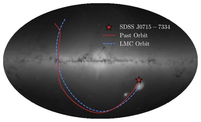 The current location of the star within the Milky Way, its historical trajectory, and the movement of the Large Magellanic Cloud are depicted in this illustration. (Vedant Chandra and the SDSS collaboration)