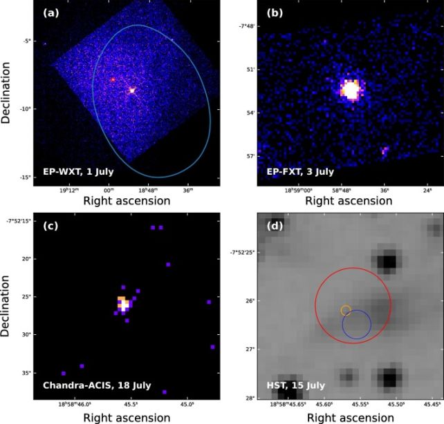 Observational data captured by the a) Einstein Probe’s Wide-field X-ray Telescope; b) Einstein Probe’s Follow-up X-ray Telescope; c) the Chandra X-ray Observatory; and d) Hubble. (Li et al., Sci. Bull., 2026)
