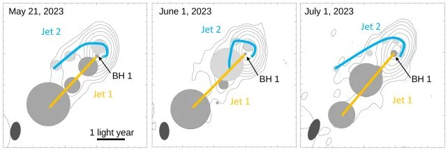 “To date, no dual jet system within a blazar core has been resolved through direct imaging,” Britzen and her collaborators state. “Consequently, the present investigation marks the first detection of a binary jet system, leading to the deduction of a pair of supermassive black holes residing within the nucleus of this blazar.”