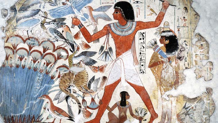 Nebamun hunting in the marshes with his wife and daughter, part of a wall painting from the tomb-chapel of Nebamun, Thebes, New Kingdom, 1350 BC. Image credit: Werner Forman Archive / Bridgeman Images.