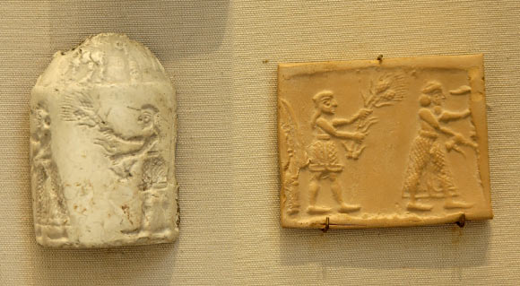 Cylinder seal and sealing impression: the king-priest and his acolyte feeding the sacred herd. Uruk period, ca. 3200 BCE. Image credit: Marie-Lan Nguyen.