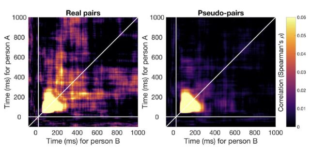However, by the 200-millisecond mark, this uniformity diverged. While neural activity remained synchronized within established pairs, it did not extend to the broader group. This heightened alignment progressively intensified as the experiment advanced, signifying increasing neurological attunement between teammates as their mutually agreed-upon classification principles were reinforced through repeated application.